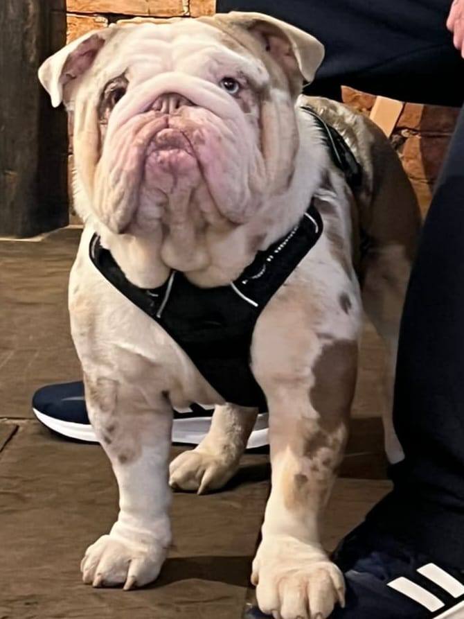 3 year old merle Winston is a fun loving british bulldog. He is fantastic with children. He comes from a big family of 6 human siblings arranging from just 7 months old to 17 years. Has a wonderful temperament and is as lazy as they come. Although he does love a walk on the beach with live in girlfriend Lila.